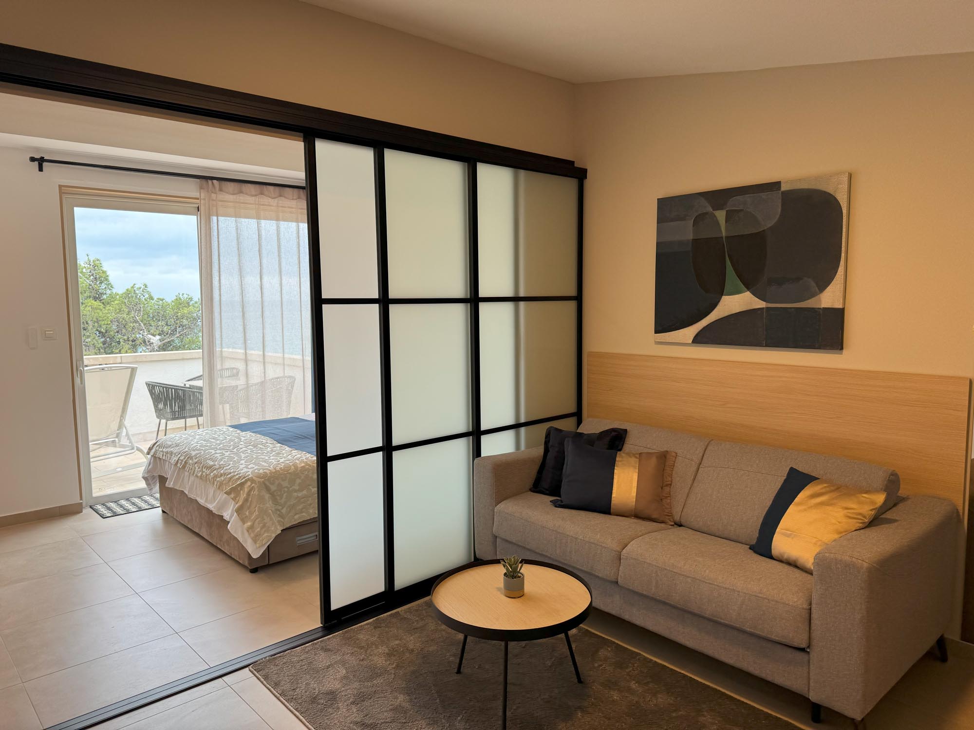 Opis: Apartman se nalazi na trećem katu i sastoji se od spavaće sobe (bračni krevet), dnevnog boravka (pomoćni ležaj za dvije osobe), kupaonice i potpuno opremljene kuhinje. Apartman ima balkon s pogledom na more.